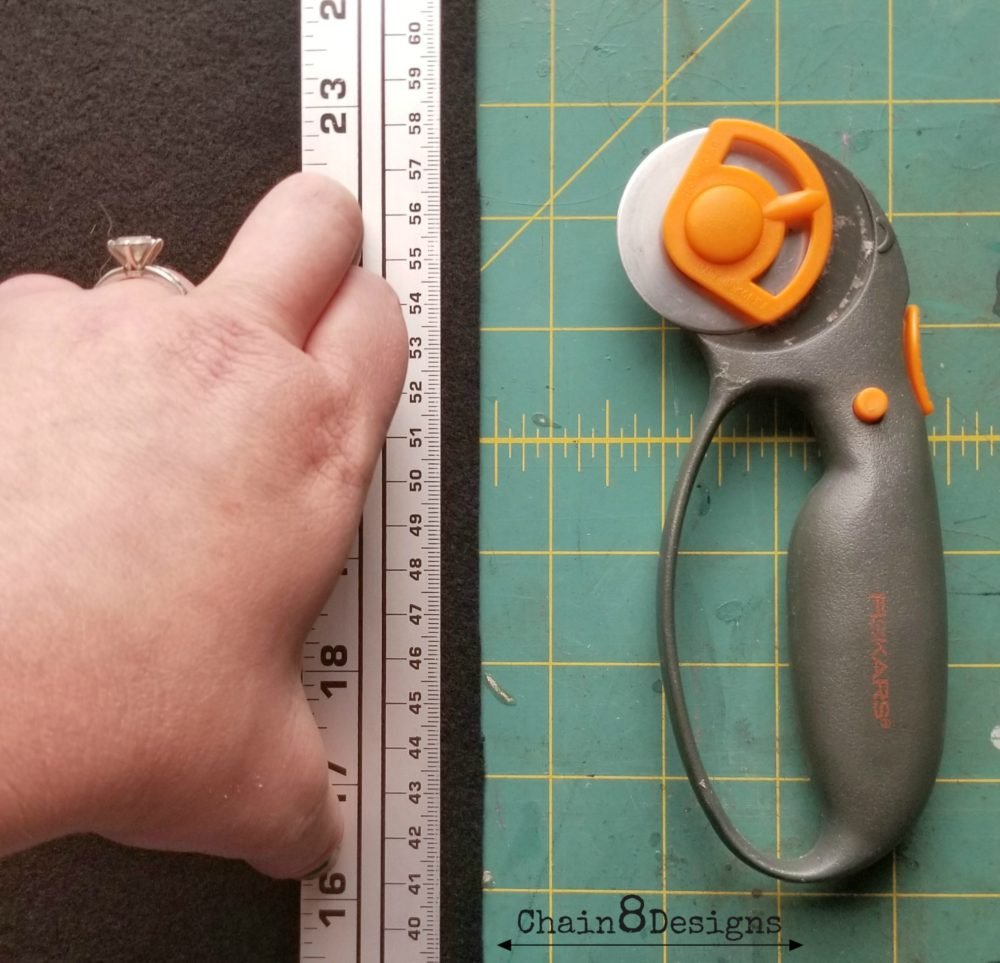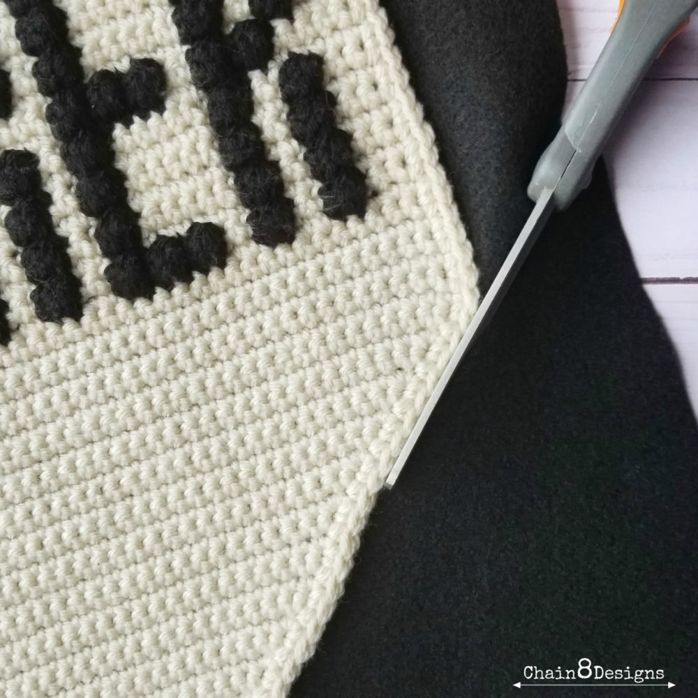 Because we need to clean up the edges and want the backing to be smaller than the actual hanging we will be trimming off a little felt from each side. This is where a lined cutting mat and rotary cutter come in handy. Lay the felt on the mat and using the lines on your board, trim off approx. 1/4″ to 1/2″ inches from each side. If you don’t have a mat and rotary cutter you can also mark the lines with fabric chalk and cut with scissors. Lay the backing onto the hanging to check that the fit is right and trim any excess. You want the backing to fit just inside the edge you created by the single crochet around the edge.