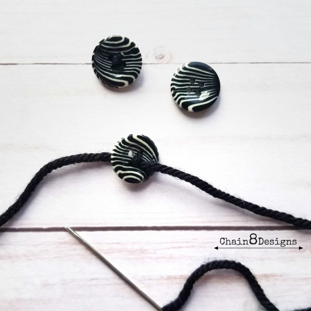Making faux sewn buttons and attaching them: Make two crosses (to mimic actual sewn buttons stitches); tie a couple of knots in the back; cut excess yarn; glue buttons as shown in the picture.