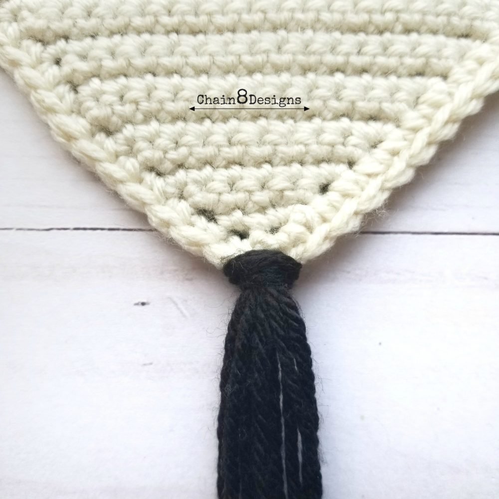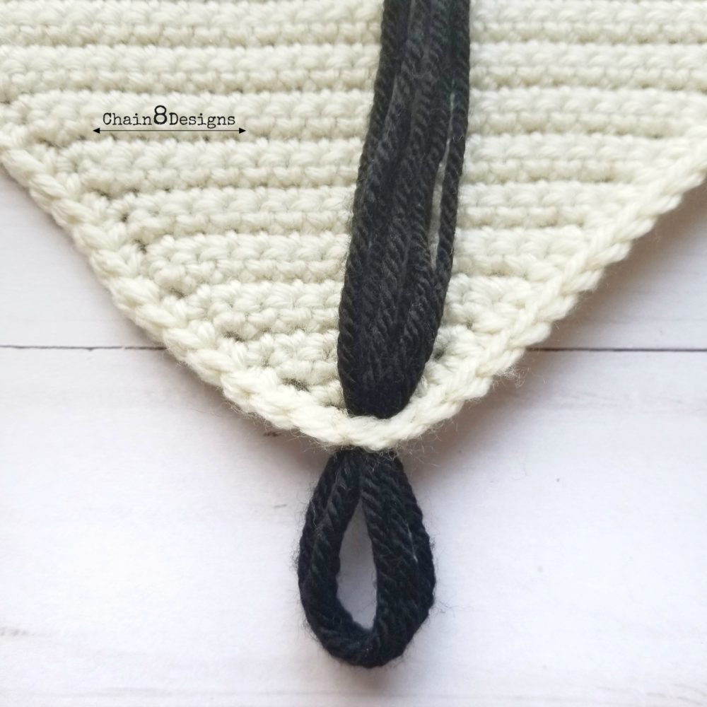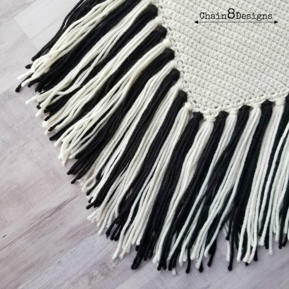 Making and attaching the tassels: Cut 60 black and 54 cream, 15″ pieces of yarn. [TIP: To save time, cut both colors together.] Insert hook into the CH 1 space at the point of the hanging. Fold four black strings in half and pull through to form a loop. Make sure that the two sides of the tassel are even, insert tail ends through loop and pull taut. Skip the next single crochet and repeat the same process but with four cream-colored strands. Keep alternating between black and cream until done.