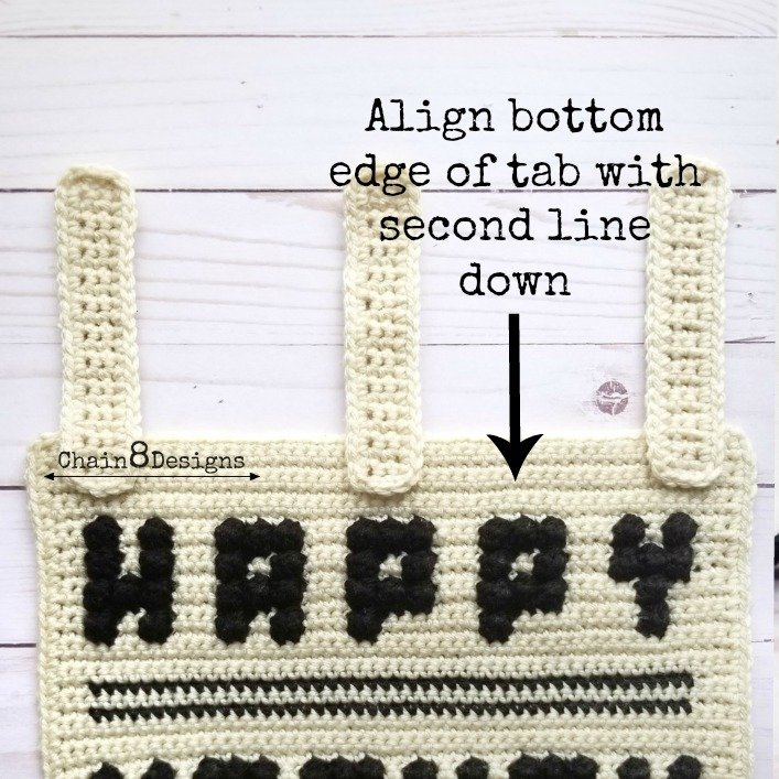 Attaching the tabs: Take each of your hanging tabs and fold them in half, finger creasing the fold. You should be able to easily tell where the crease (aka middle) is when you unfold them. This will help when you glue the tabs on the back. Hot glue the first tab in the very middle of the hanging and align the bottom edge with the second line (see pic). Glue the other two tabs just inside the outer edges. Fold the tabs at the creases and glue the tabs to the back.