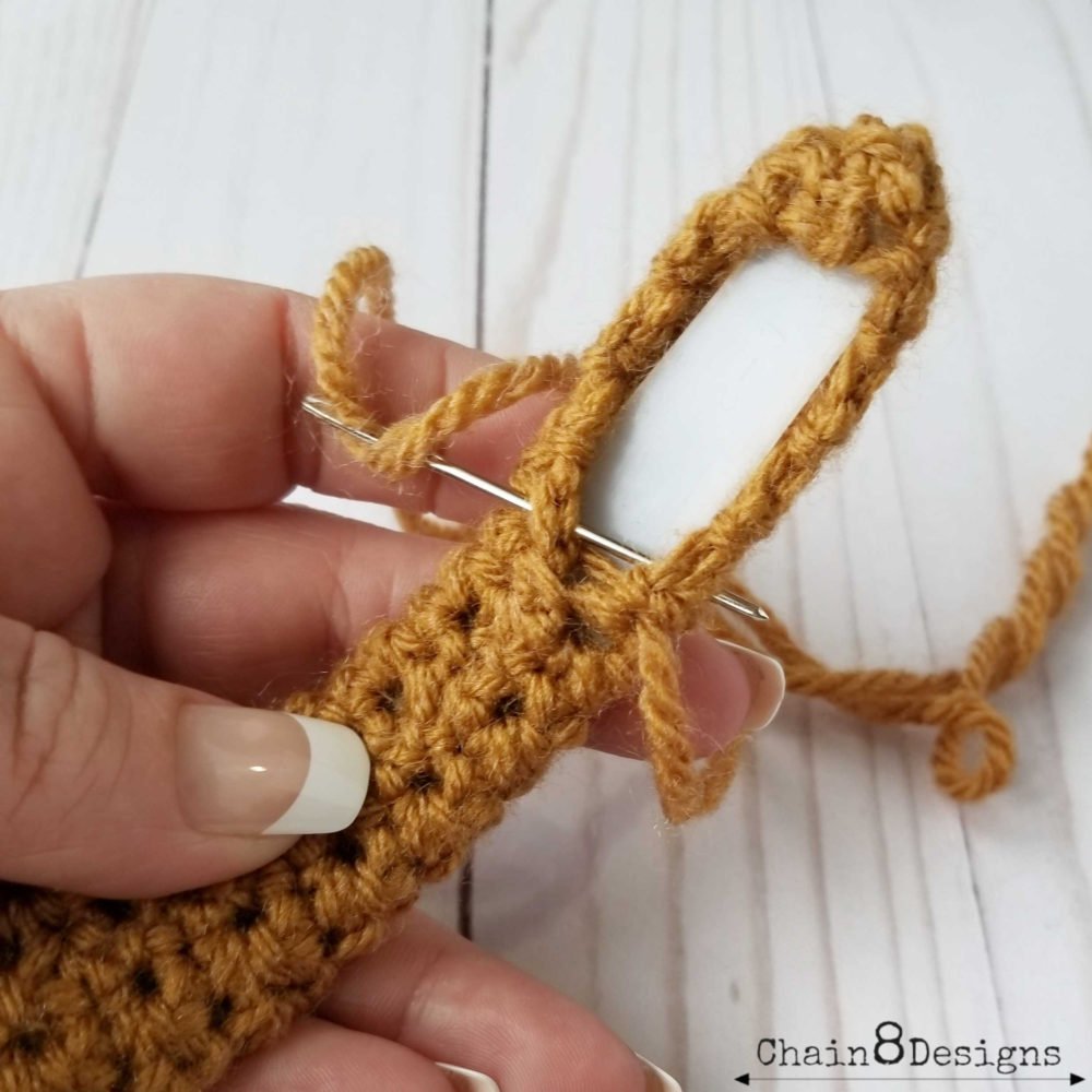 Rnd 20: SC 11; SL st in last; fasten off, leaving at least a 24″ tail for attaching to the headband cover