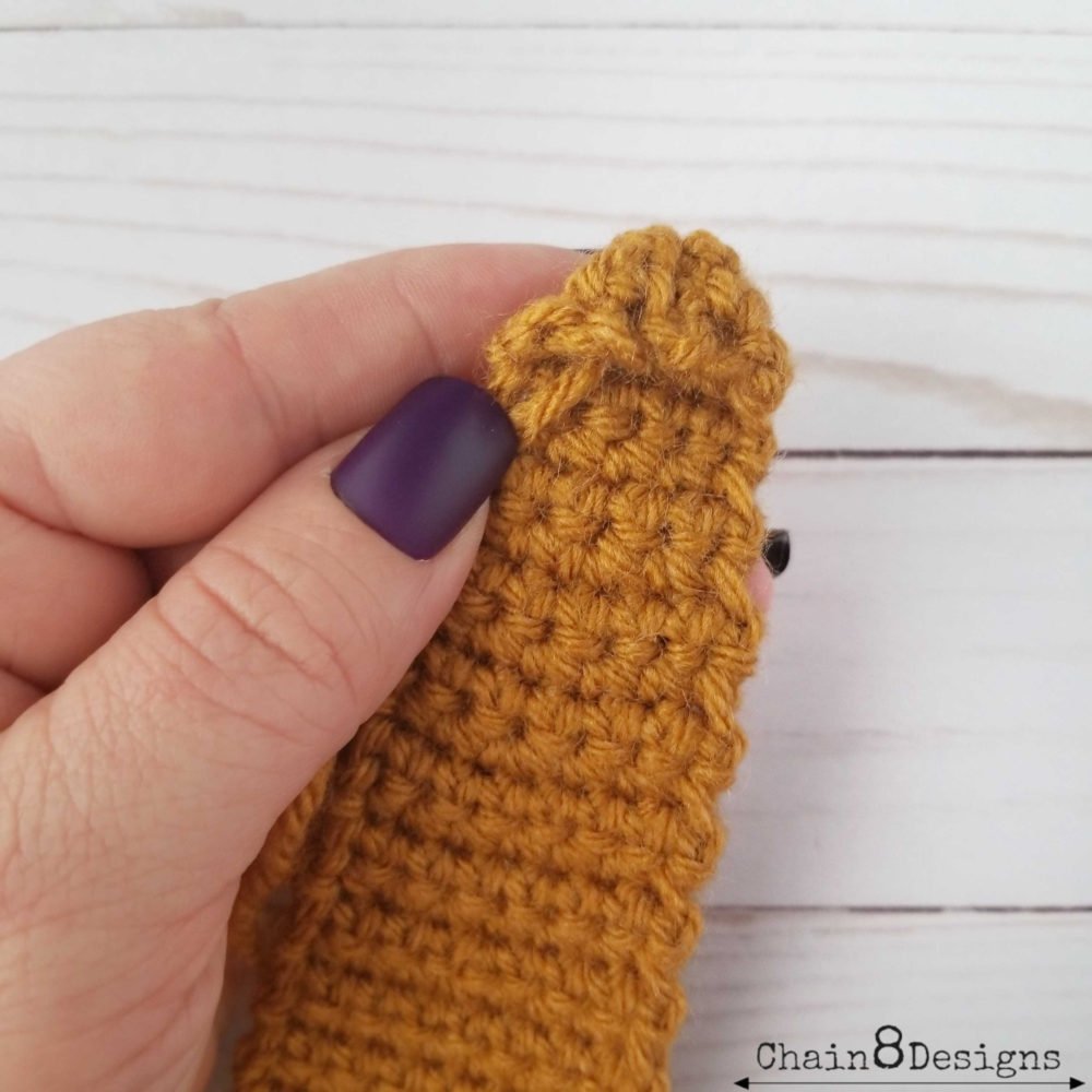 Run a bead of hot glue around the edge of the inner ear and glue to the outer ear (don’t glue the center as it makes the ear too rigid). Fold the bottom edge of the ear together and whipstitch the bottom closed and 3 stitches up the ear, making sure to enclose the inner ear.