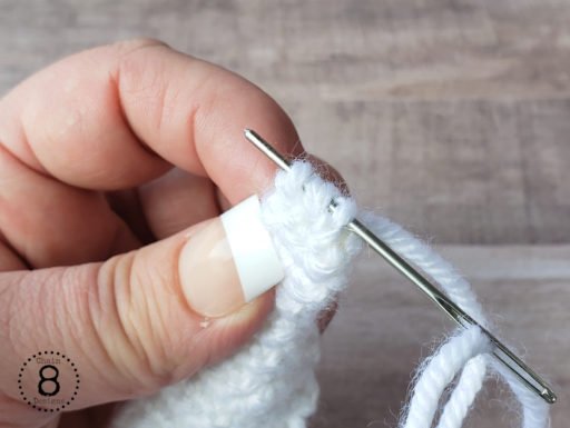 (At this point, pull the magic ring tight and weave in the end. It’s much easier to do at this point than it is once the horn is complete. We also want to attach the piece of yarn that goes around the outside of the horn that creates the faux ridges. Cut a 24″ piece of yarn. Take about 10″ of the 24″ and fold it in half. Tie two knots and cut off loop and short tail. This will help keep the yarn secure in the horn. Now insert the thread up through the middle of the horn. You can leave this piece to hang as you finish the rest of the horn.)